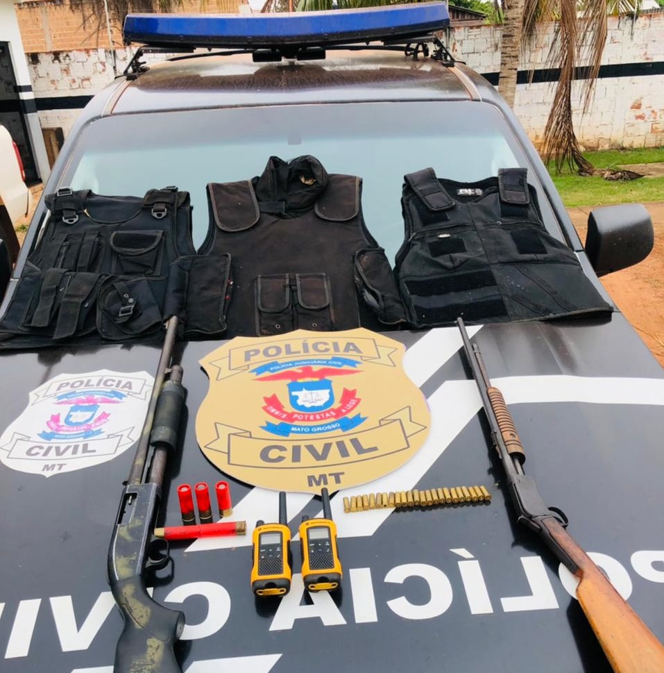 Policiais civis de Vila Bela da Santíssima Trindade (521 km a oeste de Cuiabá) apreenderam nesta quarta-feira (23), armas, coletes e rádio comunicadores durante checagem a uma denúncia sobre pessoas armadas transitando em uma propriedade, na região de fronteira do município.