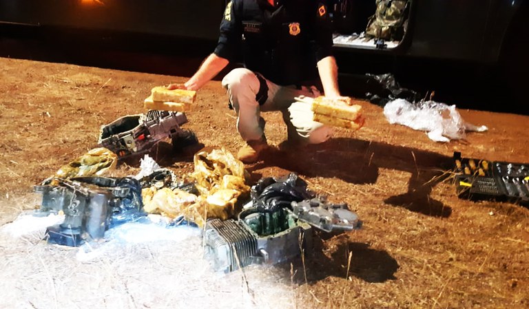A equipe localizou 03 (três) motores de motocicletas sem identificação, contendo no seu interior, envolto em sacos e graxa, a quantidade aproximada de 9,8 kg de cloridrato de cocaína.